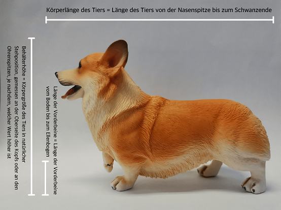 Die Abmessungen der Transportbox müssen außerdem ermöglichen, dass das Haustier auf natürliche Weise stehen, sich umdrehen und sich hinlegen kann.
